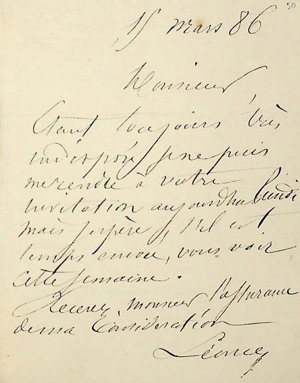Edouard-Théodore Nicole dit Léonce (1820-1900), comédien, chanteur. L.A.S., 15 mars 1886, 1p in-12. Etant indisposé, il ne peut se rendre à une invitation de son correspondant. [401]