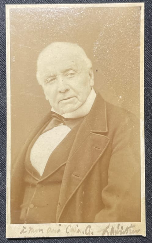 Marie Romain Thomas dit Lhéritier (1807-1885), acteur, dessinateur. Photographie originale CDV dédicacée, sd (ca.1880?). « À mon ami Cain G. Lhéritier ». Le destinataire est probablement le peintre Georges Cain (1856-1919). Aucune mention de photographe, probablement disparue suite à un collage/décollage. [401]