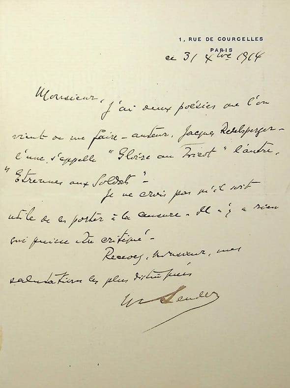 Marcelle Lender (1861-1926), actrice, chanteuse, immortalisée à plusieurs reprises par Henri de Toulouse-Lautrec. L.A.S., Paris, 31 décembre 1914, 1p in-8. « Monsieur, j'ai deux poésies que l'on vient de me faire - auteur, Jacques Redeslperger - l'un s'appelle "Gloire au Tricot" l'autre "Etrennes aux Soldats". Je ne crois pas qu'il soit utile de les porter à la censure. Il n'y a rien qui puisse être critiquer. Recevez, monsieur, mes salutations les plus distinguées. M. Lender ». On sait que le poème Etrennes aux Soldats fut chanté par Lender lors d'un gala au Trianon-Lyrique le jeudi 25 février 1915. Rare autographe. [401]