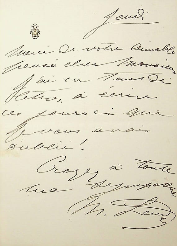 Marcelle Lender (1861-1926), actrice, chanteuse, immortalisée à plusieurs reprises par Henri de Toulouse-Lautrec. L.A.S., sd [jeudi], 1p in-8. « Merci de votre aimable pensée cher Monsieur. J'ai eu tant de lettres à écrire ces jours-ci que je vous avais oublié ! Croyez à toute ma sympathie. M. Lender ». Rare autographe. [401]