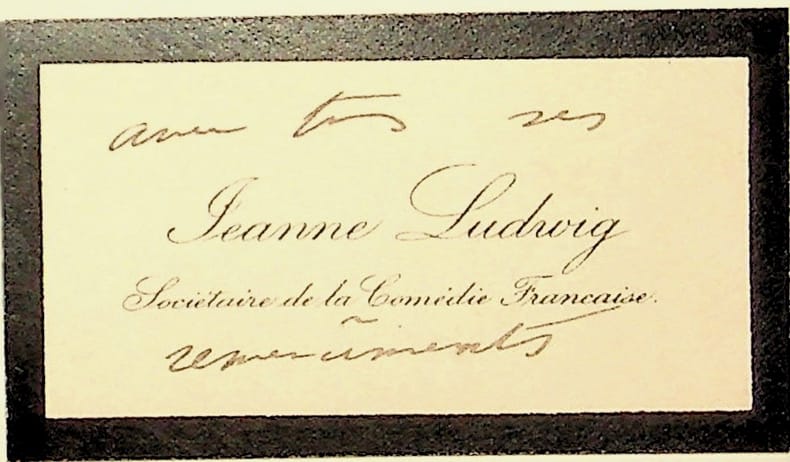 Jeanne Ludwig (1867-1898), actrice, sociétaire de la Comédie-Française. C.A., sd, 2 lignes. « Avec tous ses remerciements ». Rare autographe de cette actrice morte à seulement 30 ans. [401]