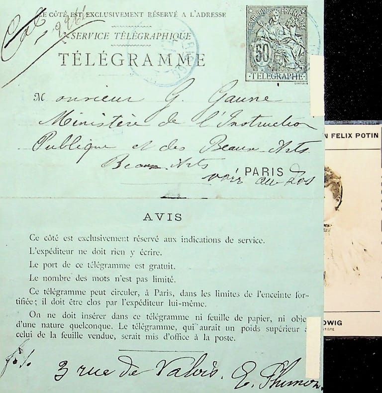 [ 3 L.A.S. adressées à Mlle Simone Arnaud Delage ] Lettre autographe signée de Camille Doucet, de l'Académie Française, 1 page à en-tête de l'Institut de France sous enveloppe marquée "Académie Française", datée du 25 mai 1885 : "Mademoiselle et chère confrère, Rien de plus touchant et de plus dramatique que votre Roche "Mengan", j'en suis encore tout ému & je m'empresse de joindre mes très sincères compliments aux remerciements que je vous dois pour votre bon et gracieux souvenir" ; Lettre autographe signée de Georges Monval, Bibliothécaire Archiviste de la Comédie Française, datée du 12 février 1883, 1 page sous enveloppe : "Mademoiselle, J'ai l'honneur de vous informer que, dans sa séance du 8 février, le Comité d'Administration du Théâtre Français a pris connaissance du rapport fait par la Commission d'examen sur votre comédie : "Mademoiselle du Vigean". J'ai en même temps le plaisir de vous annoncer que le Comité, s'associant aux conclusions de ce rapport, a réservé votre ouvrage pour l'envoyer devant le Comité de Lecture" ; Lettre autographe signée d'Albert Delpit, 4 pages sous enveloppe : "Mademoiselle, j'irai vous voir demain. [ ... ] Il est fort possible que je ne sois pas libre à 4 h ; mais plus tard. Et j'ai besoin de vous voir car j'ai des conseils importants à vous donner sur Jane Grey. Voulez-vous que nous admettions ceci ? Si vous ne receviez rien de moi, demain avant midi, c'est que j'irai rue St Pétersbourg [ ... ]