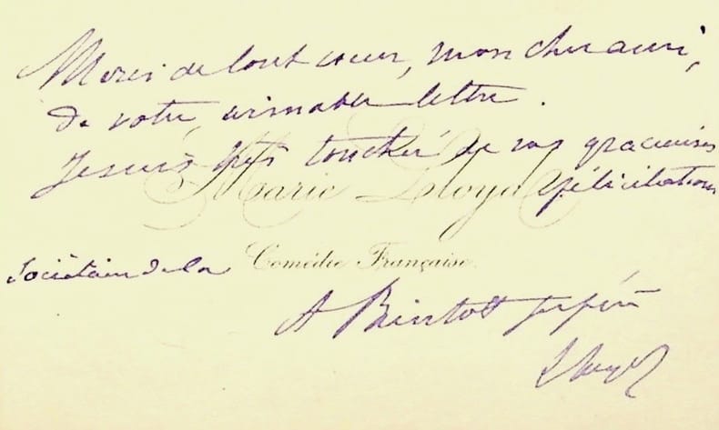 Marie-Emilie Lloyd dite mademoiselle Lloyd (1842-1897), actrice, sociétaire de la Comédie-Française. C.A.S., sd, 5 lignes. « Merci de tout coeur, mon cher ami, de votre aimable lettre. Je suis très touchée de vos gracieuses félicitations. A bientôt j'espère. Lloyd ». [401]