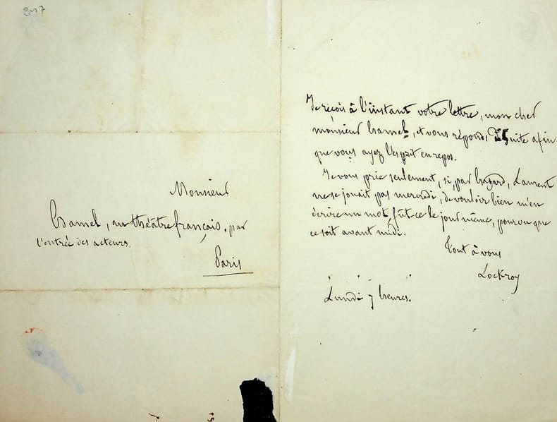 Joseph-Philippe Simon dit Lockroy (1803-1891), acteur, dramaturge. L.A.S., sd [lundi 7 heures], 1p in-8. A monsieur Hamel, au théâtre français. Il souhaite savoir avant le midi si « Laurent » n'était pas joué le mercredi. [401]