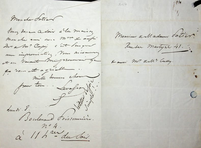 Pierre-Thomas Levassor dit Levassor (1808-1870), acteur. L.A.S., sd [lundi 8], 1p in-8. Au compositeur Henri Potier (1816-1878). Il invite le couple Potier à dîner le soir, avec M. et Mme Cussy. Il s'agit très certainement des parents de Mme Potier. Tenue : « toilette de joie simple !. ». [402]