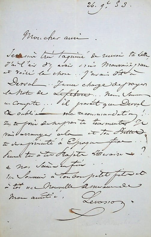 Pierre-Thomas Levassor dit Levassor (1808-1870), acteur. L.A.S., 26 novembre 1853, 1p in-8. Pour un problème de note à payer pour Lefebvre, mentionnant Dorval. [402]