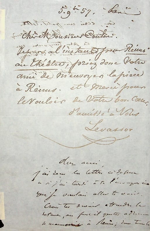 Pierre-Thomas Levassor dit Levassor (1808-1870), acteur. L.A.S., Paris, 5 septembre 1857, 1P 1/2 in-8. Court billet de Levassor à Coulon pour demander qu'on lui envoie une pièce à Reims où il se rend. Suivi d'une lettre dudit Coulon à cet ami faisant suivre l'information. Papier très fin. [402]