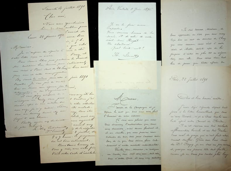 Anatole Lionnet (1832-1896), auteur, compositeur, interprète & Hippolyte Lionnet (1832-1896), chanteur, parolier. Lot de 7 L.A.S., 3 d'Anatole, 2 d'Hippolyte, 1 des deux avec une partie de chacun et signée par les deux et 1 des deux écrite par Hippolyte qui signe pour les deux, 1869-1891, environ 12p in-8. Ensemble autour de leurs activités et notamment des concerts à Bicêtre. [402]