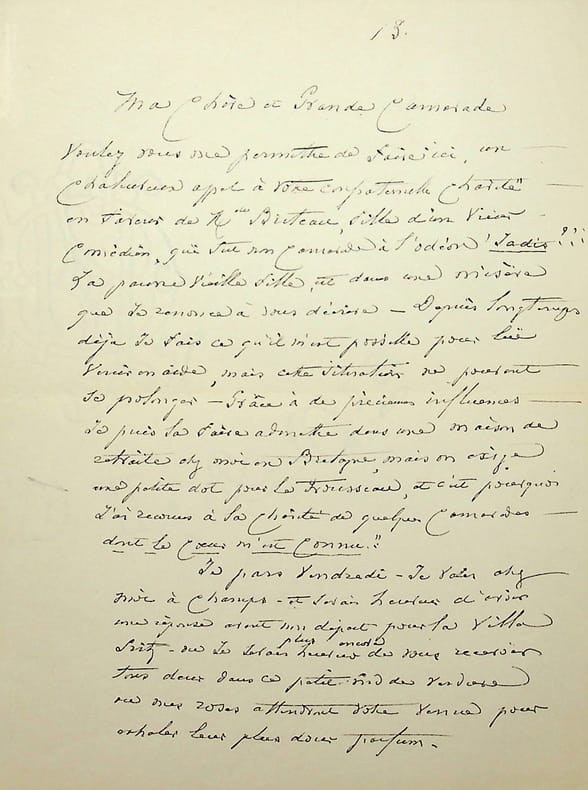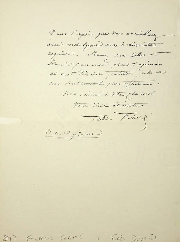 Frédéric Febvre (1833-1916), acteur et metteur en scène. L.A.S., sd [ap.1900?], 1p 1/2 in-8. A la soprano Fidès Devriès Adler (1850-1939). Il demande à sa correspondante de l'aide pour Mlle Buteau, fille d'un acteur de l'Odéon avec qui Febvre a joué. Il espère avoir une réponse rapide. [402]