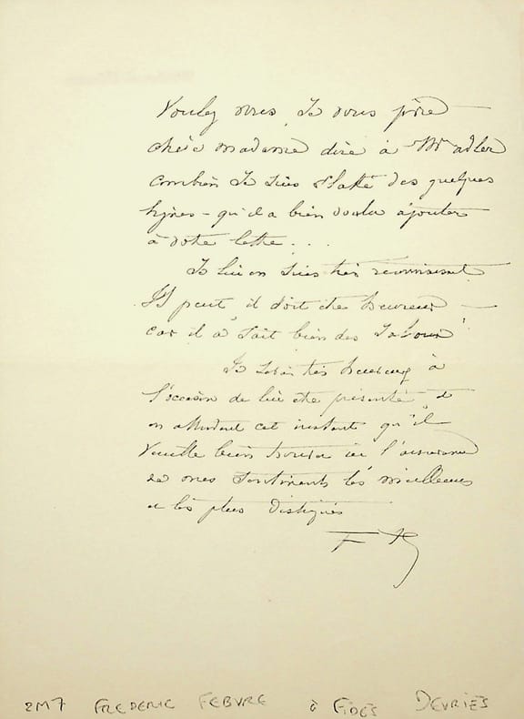 Frédéric Febvre (1833-1916), acteur et metteur en scène. L.A.S., sd [ap.1900?], 1p 1/2 in-8. A la soprano Fidès Devriès Adler (1850-1939). Il demande à sa correspondante de l'aide pour Mlle Buteau, fille d'un acteur de l'Odéon avec qui Febvre a joué. Il espère avoir une réponse rapide. [402]