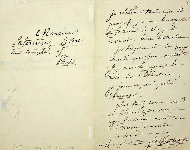 Emmanuel Lepeintre dit Lepeintre jeune (1790-1847), acteur, chansonnier, écrivain. L.A.S., 14 octobre [ap.1838], 1p in-8. A l'acteur Adolphe Laferrière (1806-1877). Il a besoin de Laferrière pour un rôle au Théâtre Saint-Marcel dans une pièce dans laquelle Lepeintre jouera aussi. [402]