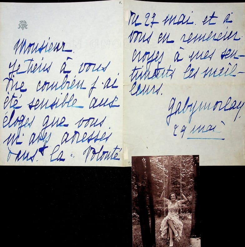 Gaby Morlay (1893-1964), actrice. L.A.S., 29 mai, 2p in-8. Peut-être à l'acteur Alexandre Mathillon (1880-1962) : « Monsieur, Je tiens à vous dire combien j'ai été sensible aux éloges que vous m'avez adressés dans la volonté du 27 mai et à vous en remercier. Croyez à mes sentiments les meilleurs. Gaby Morlay ». On joint une carte postale photo la représentant sur une balançoire (découpée). [402]