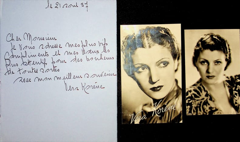 Véra Korène (1901-1996), actrice française d'origine russe. L.A.S., 21 août 1957, 1p in-4. « Cher Monsieur, Je vous adresse mes plus vifs compliments et mes voeux les plus attentifs pour bonheurs de toutes sortes. Avec mon meilleur souvenir. Véra Korène ». On joint deux CPA photographiques (découpées). [402]