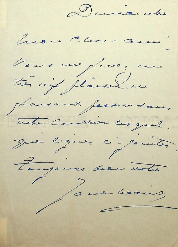 Lettre autographe signée de Félix Fénéon adressée à Gabriel Mourey, 18 lignes à l'encre noire, traces de pliure inhérentes à la mise sous pli de la lettre. Témoin et acteur privilégié de son époque, le critique d'art et collectionneur Félix Fénéon aide l'auteur Gabriel Mourey dans sa quête pourretrouver la correspondance de Paul Adam avec Maurice Barrès : "Le romancier et occultiste Paul Adam fut, comme vous savez, très lié à Maurice Barrès. (Candidats boulangistes dans deux circonscriptions lorraines contiguës, il firent fraternellement une campagne électorale et journalistique à laquelle leur amitié ne survécut guère.)Comment retrouver tous les papiers de Paul Adam, mort il y a une vingtaine d'années ? Mme Paul Adam vit-elle encore. - je n'en sais rien. Mais il est probable que vive une de ses soeurs, veuve depuis quelques trois ans de ce L. Cappielloauteur de tant d'affiches, - peintre elle aussi (et, de plus, fort sourde). Leur demeure était 8 rue Lechatelier, XVIIe. Par Mme L. Cappiello vous retrouverez peut-être des papiers barrésiens laissés par Paul Adam. Pour le cas où vous chercheriez dans cette direction, je note que que j'ai été en excellents termes avec toute la famille et que vous pouvez donc user de mon nom à votre gré." Personnalité majeure de l'Avant-garde, Fénéon avait le talent de débusquer les plus grands artistes. Cet étrange dandy volontairement discret, fit le vude servir quasi religieusement tout ce qui dans l'art forme une nouvelle sensibilité.Défenseur des néo-impressionnistes Seurat et Signac, ami de Mallarmé et de Camille Pissaro, de Paul Adam, Gustave Kahn, anarchiste puis communiste, directeur d'une douzaine de petites revues, il publia des uvres neuves telles les Illuminationsde Rimbaud, lePaludesd'André Gide,Dédalusde James Joyce. Prolifique journaliste, il écrivit partout et ne signa pas ses articles ou emprunta même des pseudonymes extravagants comme Gil de Bache, Porphyre Kalouguine, voire Thérèse ou Louise. Rare lettre de Félix Fénéon sur ses contemporains. Nous y joignions une lettre autographe signée de Fanny Fénéon, femme de Félix Fénéon, datée du 30 décembre 1941 alors que son mari était malade et alité, 10 lignes à l'encre noire, traces de pliure inhérentes à la mise sous pli de la lettre. "Mon mari gravement malade est dans l'impossibilité de recevoir quelqu'un. Si la difficultéque vous désirez lui remettre peut se résoudre par lettre, veuillez lui dire ce dont il s'agit. Une réponse immédiate vous montrera que malgré ses 80 ans, il est tout à votre disposition. [...]" - Photographies et détails sur www.Edition-Originale.com -