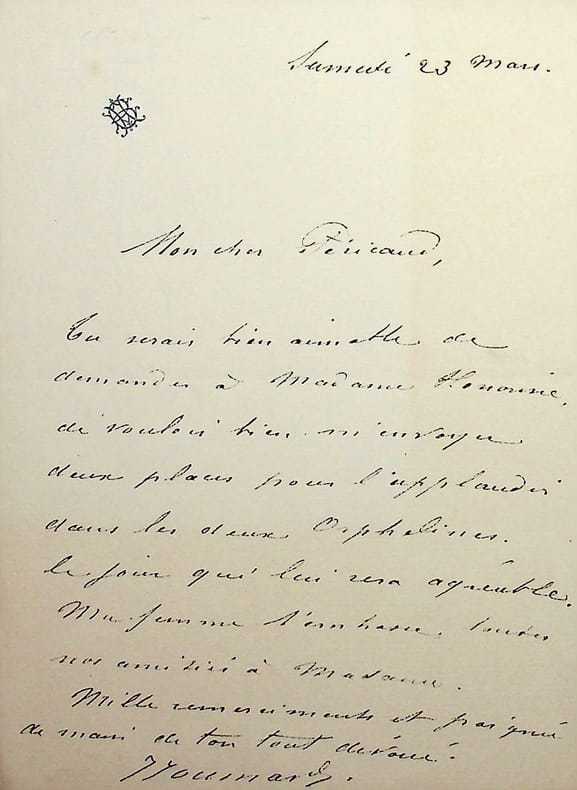Joseph Joumard (1851-1923), acteur. L.A.S., samedi 23 mars [ap.1874], 1p in-8. A l'acteur Louis Péricaud (1835-1909). Il demande deux places pour Les deux Orphelines d'Adolphe d'Ennery. Cette pièce est l'un des succès de d'Ennery et fut créée en 1874. Il semble ici que c'est lors d'une reprise. [403]