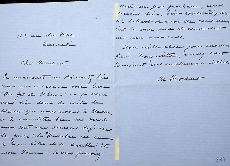 Marguerite Moreno (1871-1948), actrice. L.A.S., sd [mercredi, 1897], 1p 1/2 in-8. A l'écrivain Victor Margueritte (1866-1942). Remerciements pour son livre de poèmes, Au fil de l'heure, publié en 1896, parlant du « plaisir que nous avons à savoir et à connaître bien des vers de vous dont nous aimons déjà tant la prose », mentionnant Le Désastre, publié en 1897. Marcel Schwob et elle souhaitent le remercier de vive voix à leur retour de Biarritz. Belle lettre. [403]