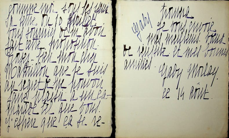Gaby Morlay (1893-1964), actrice. L.A.S., 14 août [1918], 3p in-4. Sur deux feuillets séparés à entête « Gaby ». A l'acteur Alexandre Mathillon (1880-1962) : « Mon cher camarade, Vous n'avez sans doute pas consulté Monsieur Louis Verneuil avant de m'écrire. Je puis vous dire qu'il n'est pas du tout, oh mais là, du tout d'avis que je joue sa pièce. Si vous aviez comme moi sous les yeux sa lettre du 10 juillet, vous souririez de m'avoir fait cette proposition. Croyez bien mon cher Mathillon que je suis au regret de ne pouvoir faire plaisir à un camarade tel que vous. J'espère que ça se retrouvera. Je vous envoie mes meilleurs voeux de réussite et mes bonnes amitiés. Gaby Morlay ». La pièce dont il est question est Le Traité d'Auteuil qui sera créée le 12 novembre au Théâtre Antoine. Cela nous est confirmé par une autre lettre de Morlay. Belle lettre.