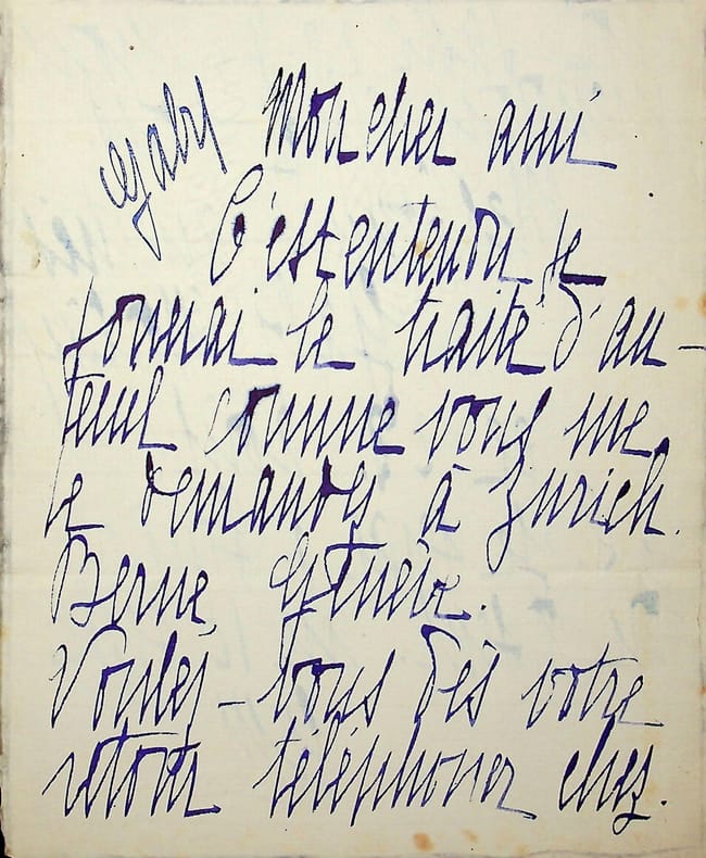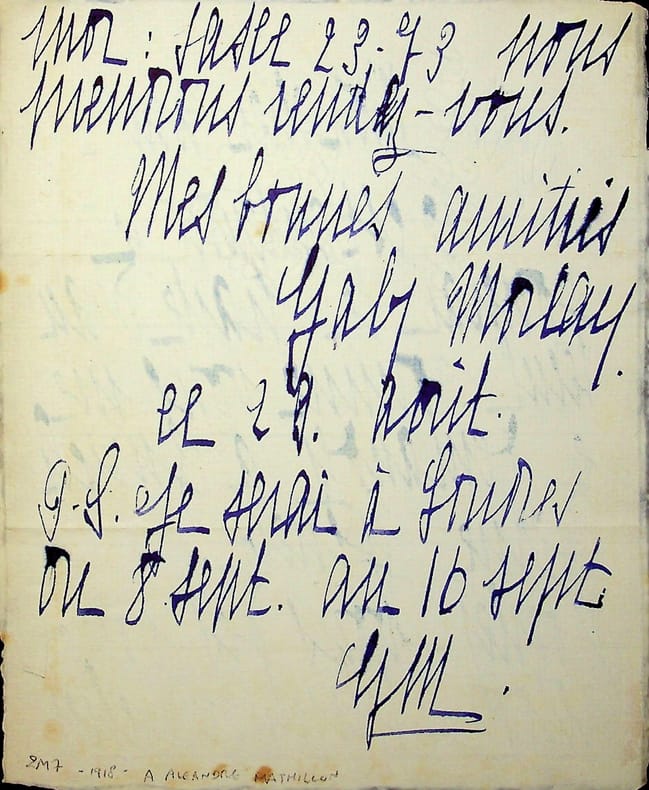 Gaby Morlay (1893-1964), actrice. L.A.S., 29 août [1918], 2p in-4. A l'acteur Alexandre Mathillon (1880-1962) : « Mon cher ami, C'est entendu, je jouerai le traité d'Auteuil comme me le demandez à Zurich, Berne, Genève. Voulez-vous dès votre retour téléphoner chez moi : [mot illisible] 23-73. Nous prendrons rendez-vous. Mes bonnes amitiés. Gaby Morlay. P.S. Je serai à Londres du 8 sept. au 16 sept. Gaby ». [403]
