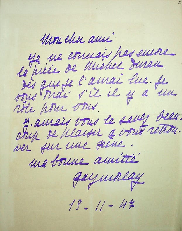 Gaby Morlay (1893-1964), actrice. L.A.S., 15 novembre 1947, 1p in-4. Peut-être à l'acteur Alexandre Mathillon (1880-1962) : « Mon cher ami, Je ne connais pas encore la pièce de Michel Duran. Dès que je l'aurai lue, je vous dirai s'il y a un rôle pour vous. J'aurais, vous le savez, beaucoup de plaisir à vous retrouver sur une scène. Ma bonne amitié. Gaby Morlay ». [403]