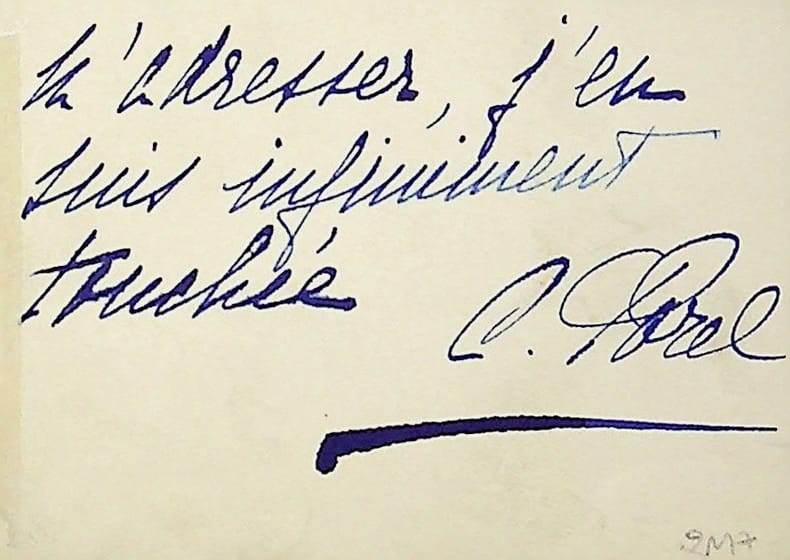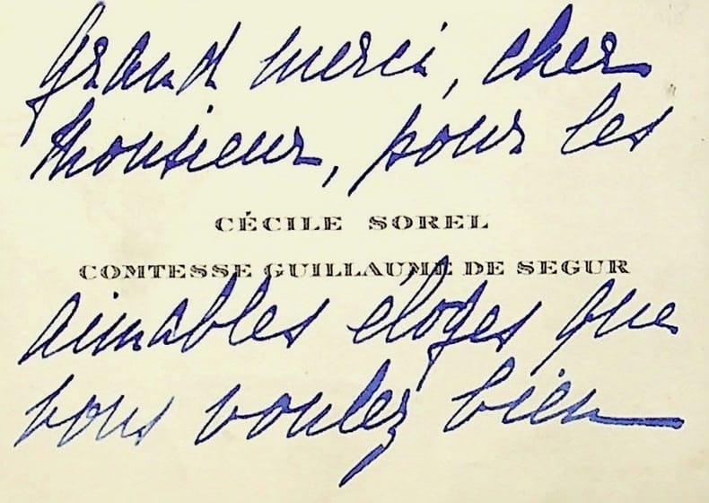 Cécile Sorel (1873-1966), comédienne, sociétaire de la Comédie-Française. C.A.S., sd, 7 lignes. « Grand merci, cher Monsieur, pour les aimables éloges que vous voulez bien m'adresser, j'en suis infiniment touchée. C. Porel ». [403]