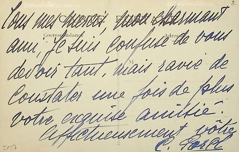 Cécile Sorel (1873-1966), comédienne, sociétaire de la Comédie-Française. L.A.S., sd, 1p in-12. Au dos d'une jolie CPA photographique la représentant. « Tous mes mercis, mon charmant ami, je suis confuse de vous devoir tant, mais ravie de constater une fois de plus votre exquise amitié. Affectueusement vôtre. C Porel ». [403]