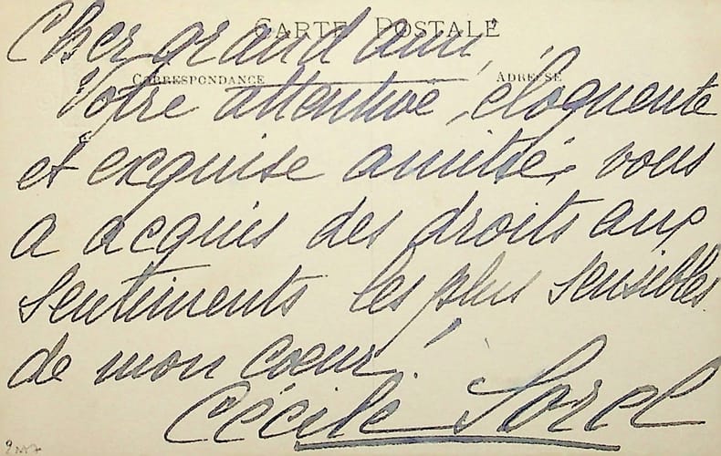 Cécile Sorel (1873-1966), comédienne, sociétaire de la Comédie-Française. L.A.S., sd, 1p in-12. Au dos d'une jolie CPA photographique la représentant. « Cher et grand ami, votre attentive, éloquente et exquise amitié vous a acquis des droits aux sentiments les plus sensibles de mon coeur. Cécile Sorel ». [403]