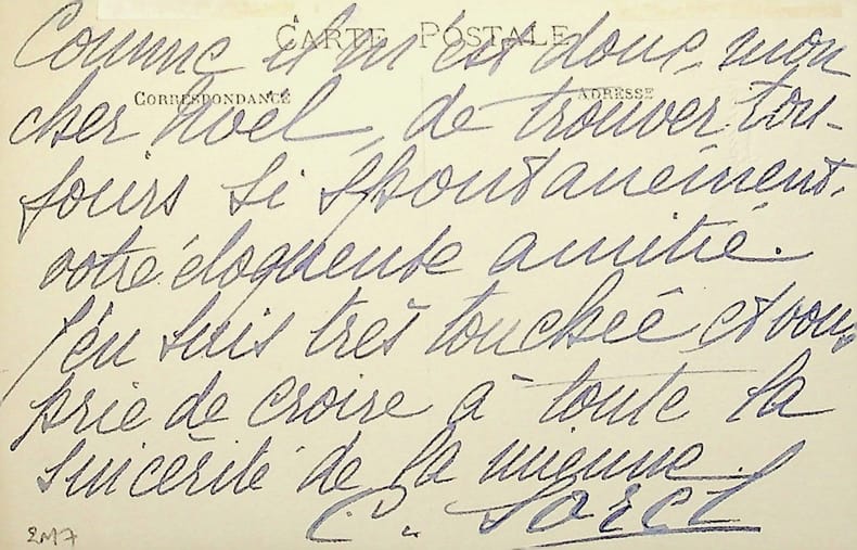Cécile Sorel (1873-1966), comédienne, sociétaire de la Comédie-Française. L.A.S., sd, 1p in-12. Au dos d'une jolie CPA photographique la représentant. « Comme il est doux, mon cher Noël, de trouver toujours si spontanément, votre éloquente amitié. J'en suis très touchée et vous prie de croire à toute la sincérité de la mienne. C Sorel ». [403]