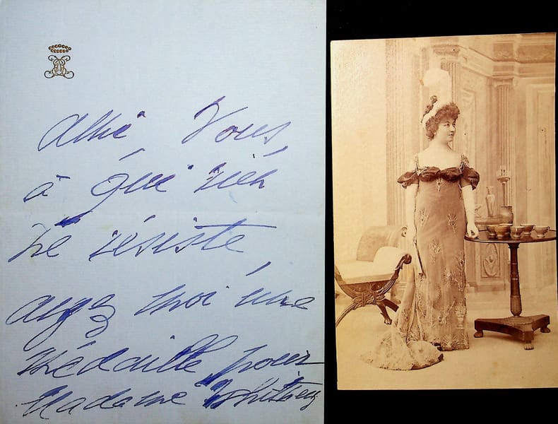Cécile Sorel (1873-1966), comédienne, sociétaire de la Comédie-Française. L.A.S., sd, 2p 1/2 in-8. « Ami, vous à qui rien ne résiste, ayez moi une médaille pour madame Whitney, une artiste digne de vous intéresser ! Je viendrai vous remercier à trois heures devant mon buste. C Sorel ». Il s'agit certainement de Grace Withney Hoff (1862-1938). On joint une jolie photographie de Sorel. [403]