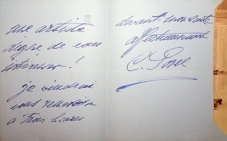 Pensée et courrier adressés à Léon Lang.Léon Lang, fondateur de la Société Godefroy Engelmann à Mulhouse, a demandé à divers artistes une pensée personnelle signée sur lart et un portrait de lartiste en vue dune exposition. Nous vous proposons ici cette pensée accompagnée d'une lettre autographe de 2 feuillets écrits au recto uniquement, reproduction d'un portrait de l'artiste en photographie jointe.