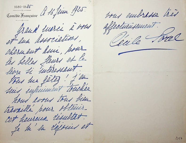 Cécile Sorel (1873-1966), comédienne, sociétaire de la Comédie-Française. L.A.S., 16 juin 1925, 1p 1/2 in-8. « Grand merci à vous et aux associations, charmant ami, pour les belles fleurs et le livre si intéressant. Vous me gâtez ! J'en suis infiniment touchée. Nous avons tous bien travaillé pour obtenir cet heureux résultat. Je m'en réjouis et vous embrasse très affectueusement. Cécile Sorel ». [403]