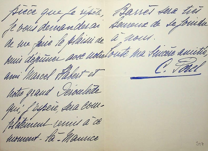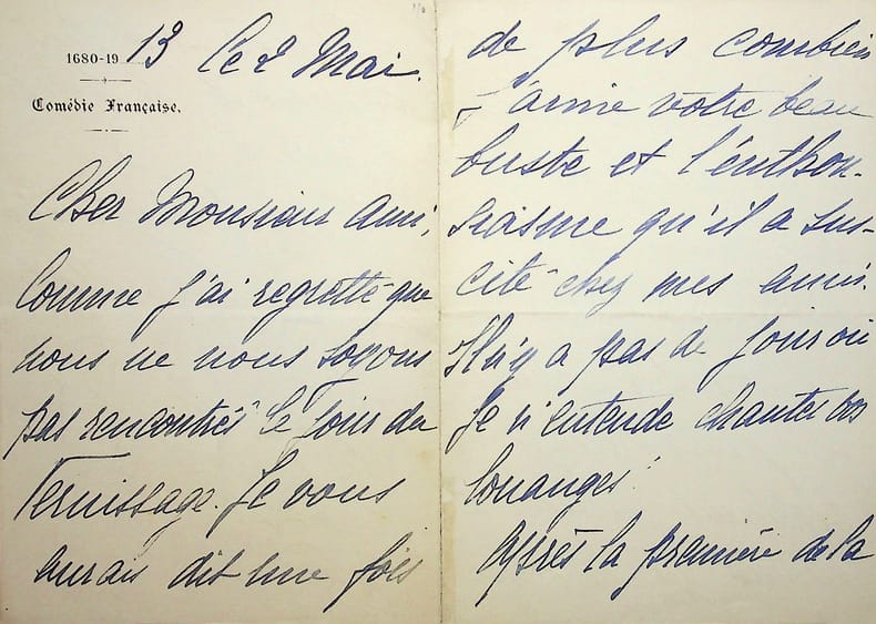 Cécile Sorel (1873-1966), comédienne, sociétaire de la Comédie-Française. L.A.S., 2 mai 1913, 3p 1/2 in-8. Au sculpteur Lucien Pallez (1853-1933) qui vient de présenter son buste au salon de 1913 : « Cher Monsieur ami, comme j'ai regretté que nous ne nous soyons pas rencontrés le jour du vernissage. Je vous aurais dit une fois de plus combien j'aime votre beau buste et l'enthousiasme qu'il a suscité chez mes amis. Il n'y a pas de jour où je n'entende chanter vos louanges. Après la première de la pièce que je répète, je vous demanderai de me faire le plaisir de venir déjeuner avec notre ami Marcel Habert et notre grand Déroulède qui, j'espère, sera complètement remis à ce moment-là. Maurice Barrès sera très heureux de se joindre à nous. Toute ma sincère amitié. C Porel ». Belle lettre. [404]
