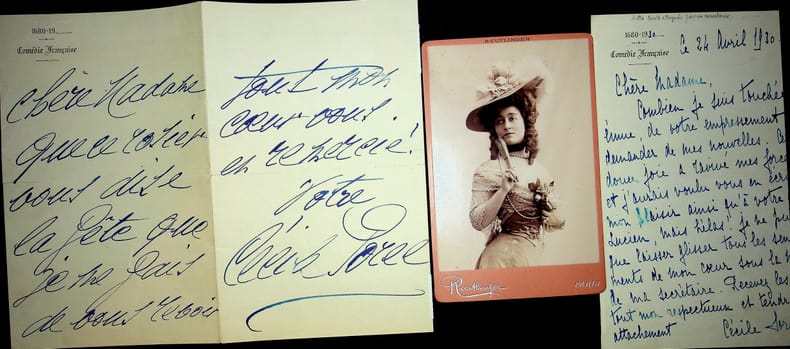 Cécile Sorel (1873-1966), comédienne, sociétaire de la Comédie-Française. L.A.S., sd, 2p in-8. « Chère Madame, que ce rosier vous dise la fête que je me fais de vous revoir. Tout mon coeur vous en remercie ! Votre Cécile Sorel ». On joint une photographie Reutlinger et une lettre écrite par sa secrétaire en 1930. [404]