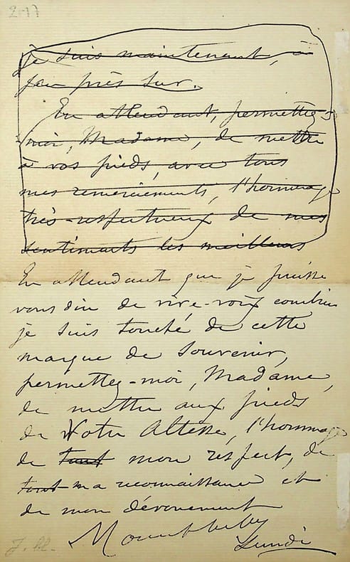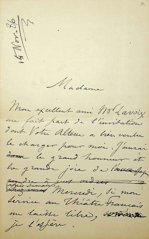 Mounet-Sully (1841-1916), acteur, sociétaire de la Comédie-Française. L.A.S., 14 novembre 1886, 2p in-8. Vraisemblablement à la princesse Mathilde Bonaparte (1820-1904), brouillon avec corrections. Son ami Henri Lavoix (1820-1892) lui a fait part de l'invitation de l'altesse. Il en est touché et espère que le théâtre le laissera libre afin qu'il réponde positivement à l'invitation. [404]