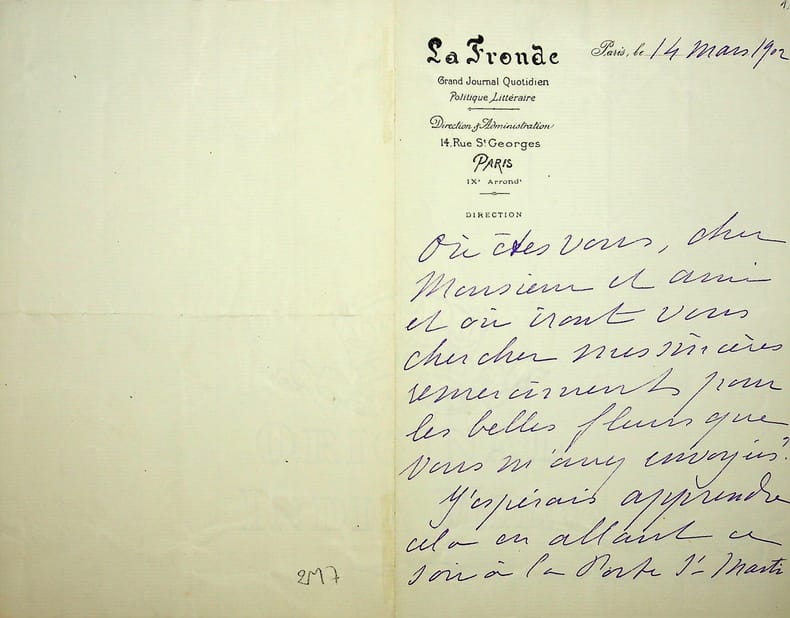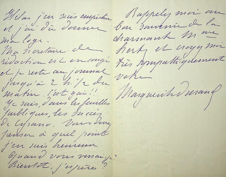 Marguerite Durand (1864-1936), actrice, journaliste, féministe, fondatrice de La Fronde. L.A.S., Paris, 14 mars 1902, 2p 1/2 in-8. Entête de son journal, La Fronde. A Henri Hertz (1875-1966), directeur du théâtre de la Porte Saint Martin : « où êtes-vous, cher Monsieur et ami, et où irons nous vous chercher. Mes sincères remerciements pour les belles fleurs que vous m'avez envoyées. J'espérais apprendre cela en allant ce soir à la Porte Saint Martin. Hélas, j'en suis empêchée et j'ai dû donner ma loge. Ma secrétaire de rédaction est envoyée et je reste au journal jusqu'à 2h 1/2 du matin. C'est gai !! Je suis, dans les feuilles publiques, les succès de Cyrano. Vous devez penser à quel point j'en suis heureuse. Quand vous verrai-je ? Bientôt, j'espère ? Rappelez-moi au bon souvenir de la charmante Mme Hertz et croyez-moi très sympathiquement votre Marguerite Durand ». Cyrano de Bergerac avait été créée le 28 décembre 1897. Elle fut jouée 200 fois puis reprise de 1900 à 1902. Très belle lettre, rare. [404]
