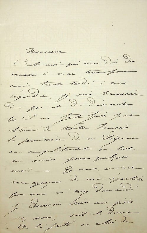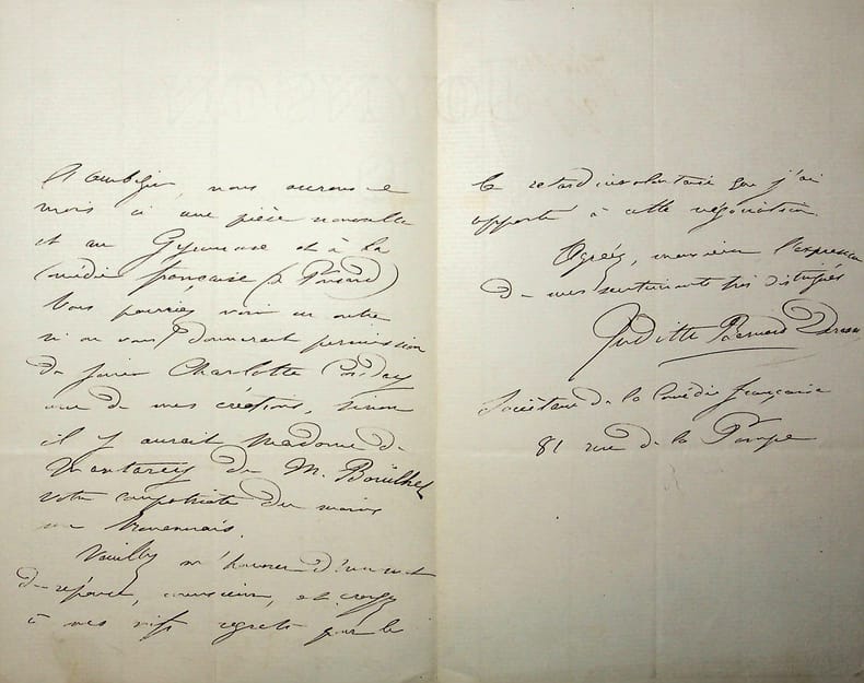 Julie Bernat dite Mademoiselle Judith (1827-1912), actrice, sociétaire de la Comédie-Française. L.A.S., sd [25 juin selon une note d'une autre main], 2p 1/2 in-8. A un directeur de théâtre avec lequel elle souhaite travailler, indiquant ses prochains engagements. [404]