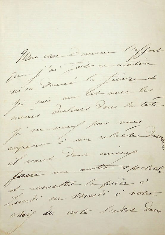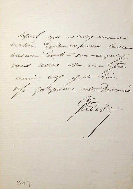 Julie Bernat dite Mademoiselle Judith (1827-1912), actrice, sociétaire de la Comédie-Française. L.A.S., sd, 2p in-8. Elle demande à son correspondant de remettre une pièce au lundi ou mardi suivant, ayant une fièvre. [404]