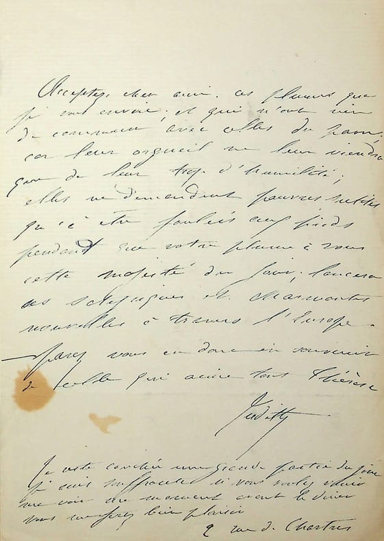 Julie Bernat dite Mademoiselle Judith (1827-1912), actrice, sociétaire de la Comédie-Française. L.A.S., sd, 1p in-8. « Acceptez, cher ami, ces fleurs que je vous envoie et qui n'ont rien de concurrent avec celles du paon car leur orgueil ne leur viendra que de leur trop d'humilité. Elle ne demandent, pauvres petites, qu'à être foulées aux pieds pendant que votre plume à vous, cette majesté du jour, lancera des [mot illisible] et charmantes nouvelles à travers l'Europe. Parez-vous donc en souvenir de celle qui aime tant Thérèse. Judith. Je reste couchée une grande partie du jour. Je suis souffrante. Si vous voulez venir me voir un moment avant le diner, vous me ferez bien plaisir ». Jolie lettre. [404]