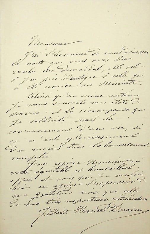 Julie Bernat dite Mademoiselle Judith (1827-1912), actrice, sociétaire de la Comédie-Française. L.A.S., sd, 1p in-8. L'écriture devient un peu tremblante. Elle envoie à son correspondant ses « états de service » pour une récompense qu'elle sollicite. [404]