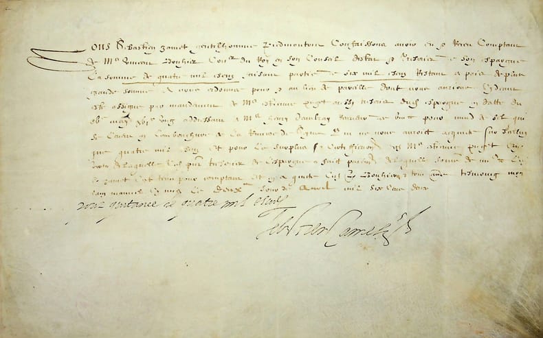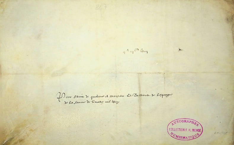 Sébastiano Zametti dit Sébastien Zamet (1549-1614), financier italien naturalisé français. P.S. « Sebastien Zamet » avec une ligne autographe « pour quittance de quatre mil escus », 2 avril 1602, 1p in-4 oblong. « Nous Sébastien Zamet gentilhomme piedmontois confaissons avoir eu & receu comptant de Me Vincent Bouhier Con[seill]er du Roy en son Conseil destat & trésorier de son espargne la somme de quatre mil escus faisant partie de six mil escus restant à paier de plus grande somme [.] pour muid de sel qui se lèvent en l'ambouchure de la rivière de la Seyne [.] ». Le document mentionne ainsi les trésoriers Vincent Bouhier (?-1631) et Estienne Puget et le receveur général des finances de Rouen Henry Dambray (ca.1553-1609). Très intéressant document prouvant la spéculation sur le sel opérée par Zamet qu'on disait riche de « deux millions d'or ». Provenance : F.H. Monge avec cachet de collection au dos. Autographe rare. [132]