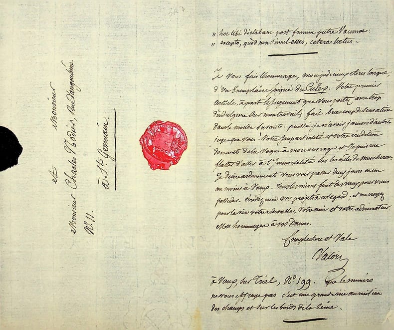 Henri-Zozime de Valori (1786-1859), écrivain. L.A.S., sd [après le 31 octobre 1817], 1p in-8. A l'écrivain Charles Nodier (1780-1844) qui vient de publier un article sur la traduction du Culex de Virgile par Valori dans le Journal des Débats du 31 octobre : « Hoc tibi dictabam post famum putre Vacunae Excepto, quod non simul esses, cetera laetus. Je vous fais l'hommage, mon judicieux Aristarque, d'un exemplaire soigné du Culex. Votre premier article, à part le jugement que vous portez avec trop d'indulgence sur mon travail, fait beaucoup de sensation dans le monde savant. Puissé-je n'avoir jamais d'autres juges que vous ! Votre impartialité et votre érudition donnent de la vogue à mon ouvrage et je puis me flatter d'aller à l'Immortalité sur les ailes du moucheron. Je désire ardemment vous voir passer deux jours ou un au moins à Vaux. Tous les miens font des voeux pour vous posséder. Écrivez-moi vos projets à cet égard ; et me croyez pour la vie votre redevable, votre ami et votre admirateur. Mes hommages à vos Dames. Complectare et Vale Valori à Vaux, sur Triel, n°199. Que le numéro ne vous effraye pas, c'est une grande rue au milieu des champs et sur les bords de la seine ». Cachet de cire au dos mais les armes sont illisibles. Très belle lettre à celui qui aida à son succès, autographe peu commun. [109]