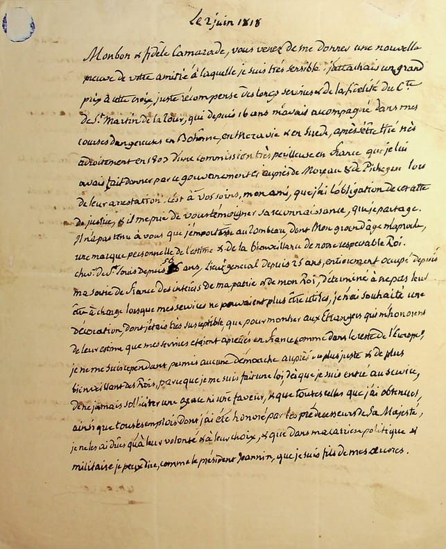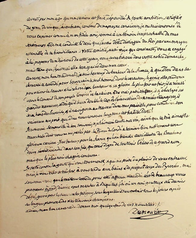 Charles-François Dumouriez (1739-1823), général, vainqueur à Valmy. L.A.S., 2 juin 1818, 2p in-4. Importante lettre au maréchal Etienne Macdonald (1765-1840) qui n'a su obtenir de décoration pour son ami le comte de Saint Martin de la Tour et pour lui-même. « Mon bon & fidèle camarade, vous venez de me donner une nouvelle preuve de votre amitié à laquelle je suis très sensible. J'attachais un grand prix à cette croix, juste récompense des longs services & de la fidélité du Comte de Saint Martin de la Tour, qui depuis 16 ans m'avait accompagné dans mes courses dangereuses en Bohême, en Moravie & en Suède, après s'être tiré très adroitement en 1803 d'une commission très périlleuse en France que je lui avais fait donner par ce gouvernement-ci auprès de Moreau & de Pichegru lors de leur arrestation. C'est à vos soins, mon ami, que j'ai l'obligation de cet acte de justice, & il me prie de vous témoigner sa reconnaissance, que je partage. Il n'a pas tenu à vous que j'emportasse au tombeau, dont mon grand âge m'approche, une marque personnelle de l'estime & de la bienveillance de notre respectable Roi. Chevalier de Saint Louis depuis 56 ans, Lieutenant général depuis 25 ans, entièrement occupé depuis ma sortie de France des intérêts de ma patrie & de mon Roi, déterminé à ne pas leur être à charge lorsque mes services ne pouvaient plus être utiles, je n'ai pas souhaité une décoration, dont j'étais très susceptible, que pour montrer aux Etrangers qui m'honorent de leur estime que mes services étaient appréciés en France comme dans le reste de l'Europe ; je ne me suis cependant permis aucune démarche auprès du plus juste & du plus bienveillant des Rois, parce que je me suis fait une loi, dès que je suis entré au service, de ne jamais solliciter une grâce ni une faveur, & que toutes celles que j'ai obtenues, ainsi que tous les emplois dont j'ai été honoré par les prédécesseurs de Sa Majesté, je ne les ai dûs qu'à leur volonté & à leur choix, & que dans ma carrière politique & militaire, je peux dire, comme le président Jeannin, que je suis de mes oeuvres. Averti par mon âge que ma carrière est finie, dépouillée de toute ambition, satisfait du genre de vie que j'ai embrassé, content de ma propre conscience, je me suis contenté de vous exprimer comme à mon fidèle ami, comme à un témoin irréprochable de mes sentiments & de ma conduite le désir que j'avais d'être distingué du Roi par une marque ostensible de sa bienveillance. Votre amitié, aussi vive que constante, vous a engagé à lui proposer de m'honorer de cette grâce, vous avez échoué dans votre noble démarche, mais tant que j'existerai, elle sera gravé dans mon coeur. Au reste, mon bon Macdonald, je suis heureux du bonheur de la France, à qui Dieu dans sa clémence a accordé pour souverain le seul homme dont le caractère, le génie & la prudence pouvaient la sauver & lui rendre son bonheur & sa gloire. Le plus fort est fait, il a rétabli dans le conseil de son peuple l'empire de la raison & du vrai patriotisme, il a développé ses grandes ressources, & dès qu'il aura doublé le cap de l'évacuation des armées étrangères, il sera hors des écueils, & il naviguera au travers d'une mer paisible pour conduire son vaisseau au port. Que Dieu nous conserve longtemps cet habile Pilote ! Je remercie Sémonville de son bon souvenir, & je l'aimerai toute ma vie, ainsi que la très aimable maréchale dont vous ne me parlez pas. Le Prince de Condé a terminé bien noblement une glorieuse carrière. Il est fâcheux pour la France qu'une branche aussi illustre des Bourbons doive s'éteindre dans son fils, qui était digne de soutenir l'éclat de ce grand nom, mais que le plus noir chagrin consume. Je peste contre la goute qui vous tourmente, & qui me prive du plaisir de vous embrasser, mais je vous exhorte très fort à vous rendre aux bains & de préférer ceux des Pyrénées. Mais souvenez-vous que le meilleur remède pour cette affreuse maladie c'est de beaucoup vous promener à pied, dussiez-vous m