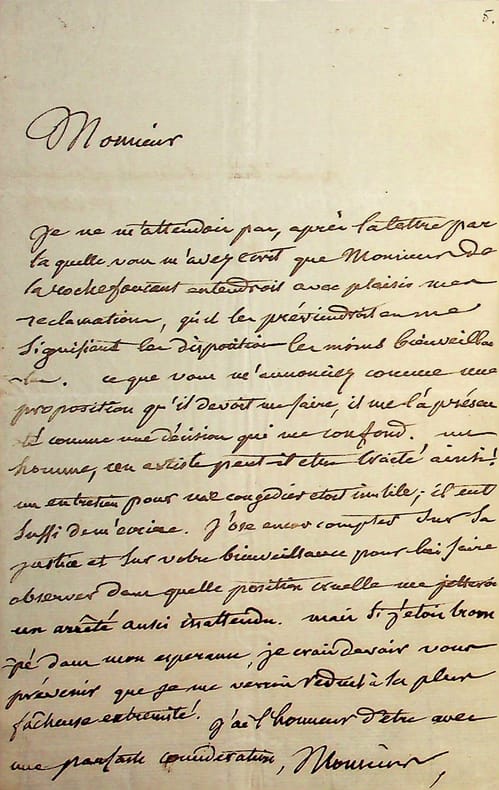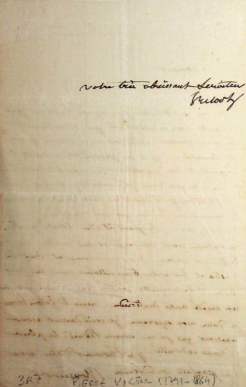 Pierre-Antoine-Victor Lerebours dit Pierre Victor (1791-1864), écrivain, tragédien, pensionnaire de la Comédie-française, élève du tragédien Talma. L.A.S., sd [ca.1827], 1pŒ in-8. « Monsieur, Je ne m'attendais pas, après la lettre par laquelle vous m'avez écrit que Monsieur de La Rochefoucauld entendroit avec plaisir mes réclamations, qu'il les préviendrait en me signifiant les dispositions les moins bienveillantes. Ce que vous m'annonciez comme une proposition qu'il devoit me faire, il me l'a présenté comme une décision qui me confond. Un homme, un artiste, peut-il être traité ainsi ! Un entretien pour me congédier était inutile ; il eut suffi de m'écrire. J'ose encor compter sur la justice et sur votre bienveillance pour lui faire observer dans quelle position cruelle me jetteroit un arrêté aussi inattendu. Mais si j'étois trompé dans une espérance, je crois devoir vous prévenir que je me verrais réduit à la plus fâcheuse extrémité. J'ai l'honneur d'être avec une parfait considération, Monsieur, votre bien obéissant serviteur. PVictor ». Le vicomte Sosthènes de La Rochefoucauld (1785-1864), fut directeur des Beaux-Arts d'août 1824 à la révolution de 1830. Durant cette période, il y eut des plaintes contre plusieurs directions de théâtre, comme celui de l'Odéon. Cette lettre est probablement écrire fin 1826 ou début 1827, au moment de la mort de Talma, quand le baron Taylor, commissaire royal au Théâtre français se sépare de Victor. La Rochefoucauld n'apporte donc aucun soutien à Victor, ce dont il se plaint à son correspondant. Peu commun. [109]