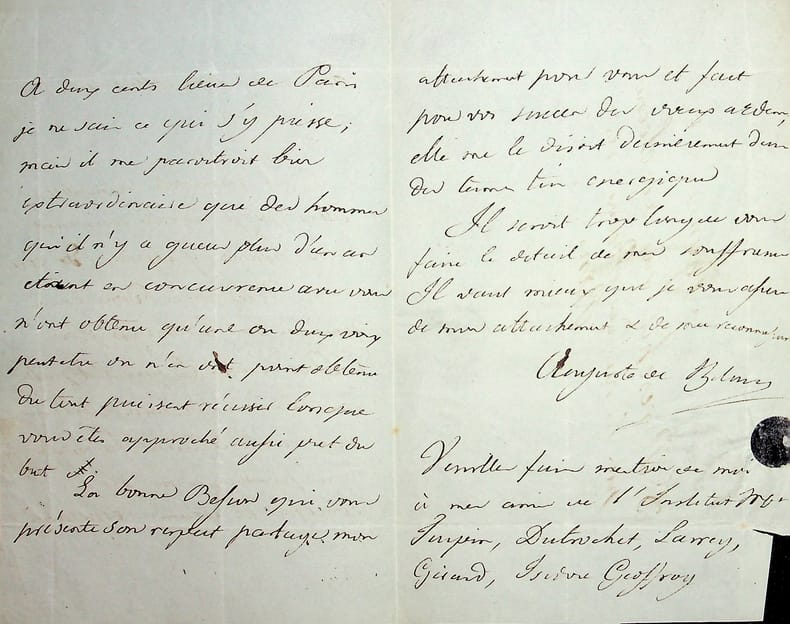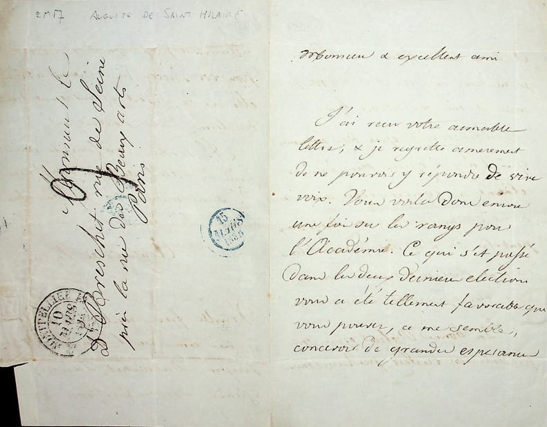 Auguste de Saint-Hilaire (1779-1853), botaniste, explorateur. L.A.S., 10 mars 1835, 3p in-8. Au docteur Gilbert Breschet (1784-1845). « Monsieur et excellent ami, J'ai reçu votre aimable lettre & je regrette amèrement de ne pouvoir y répondre de vive voix. Vous voilà donc encore une fois sur les rangs pour l'Académie. Ce qui s'est passé dans les deux dernières élections vous a été tellement favorable que vous pouvez, ce me semble, concevoir de grandes espérances. A deux cents lieues de Paris je ne sais ce qui s'y presse ; mais il me paraitrait bien extraordinaire que des hommes qu'il n'y a guère plus d'un an étaient en concurrence avec vous n'ont obtenu qu'une ou deux voix peut-être ou n'en ont point obtenu du tout puissent réussir lorsque vous être approché aussi prêt du but. La bonne Be. qui vous présente son respect partage mon attachement pour vous et fait pour vos succès des voeux ardents ; elle me le dirait dernièrement dans des termes très énergiques. Il serait trop long de vous faire le détail de mes souffrances. Il vaut mieux que je vous assure de mon attachement & de ma reconnaissance. Auguste de Saint Hilaire Veuillez faire mention de moi à mes amis de l'Institut [mot illisible] Turpin, Dutrochet, Larrey, Girard, Isidore Geoffroy ». Nous n'avons pas trouvé la date précise de l'élection de Breschet à l'Académie des Sciences mais il succède à Guillaume Dupuytren, mort le 8 février 1835. Saint Hilaire ne s'est donc pas trompé en prédisant l'élection de Breschet. Les amis que Saint-Hilaire cite sont Pierre-Jean-François Turpin (1775-1840), Henry Dutrochet (1776-1847), Dominique-Jean LArrey (1766-1842) et Isidore Geoffroy Saint-Hilaire (1805-1861). Beau document, peu commun. [133]