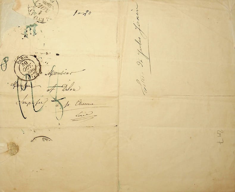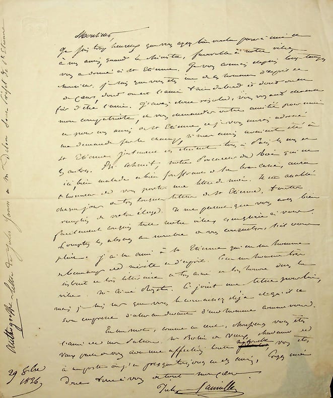 Jules Janin (1804-1874), écrivain, membre de l'Académie française. L.A.S., 29 octobre 1836, 1p in-4. A Alexandre Delon, nouveau sous-préfet de Saint-Etienne : « Monsieur, Je suis trop heureux que vous ayez bien voulu penser à moi et à mes amis, quand le Ministre, favorable à notre ville, vous a donné à Saint Etienne. Je vous connais depuis longtemps, Monsieur, je sais que vous êtes un de ces hommes d'esprit et de coeur dont on est l'ami tout d'abord et dont on est fier d'être l'ami. J'avais donc résolu, vous voyant devenu mon compatriote, et vous demander votre amitié pour moi et pour mes amis de Saint Etienne, et je vous aurais adressé ma demande sur le champ, si mes amis avaient été à Saint Etienne justement. Ils étaient tous à Paris les uns et les autres. M. Schmit, notre procureur du Roi qui est ici bien malade et bien souffrant et [mots illisibles], aura l'honneur de vous porter une lettre de moi. Il est accablé chaque jour de très longues lettres de Saint Etienne, toutes remplies de votre éloge. Il me promet que vous avez bien facilement conquis toute notre ville [mot illisible] si vous comptez les absents au nombre de vos conquêtes, s'il vous plait. J'ai un ami à Saint Etienne qui est un homme de beaucoup de mérite et d'esprit. C'est un monsieur très instruit et très littéraire et très aimé et très heureux dans la ville. M. Aimé Rozet [?]. Ci-joint une lettre pour lui, mais je suis sûr que vous le connaissez déjà et qu'il se sera empressé d'aller au devant d'un homme comme vous. En un mot, comme en cent, Monsieur, vous êtes l'ami de mon Patron, Mr Rolin de Vaux [?]. Monsieur de Vaux parle et vous avez une affection toute maternelle, vous êtes à un poste où j'ai presque toujours eu des amis. Croyez-moi donc tout à vous de tout mon coeur. Jules Janin » Belle lettre. [132]
