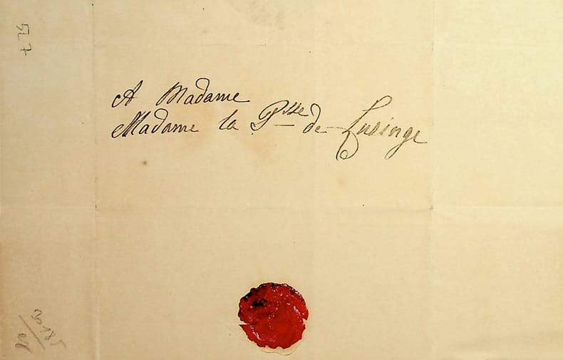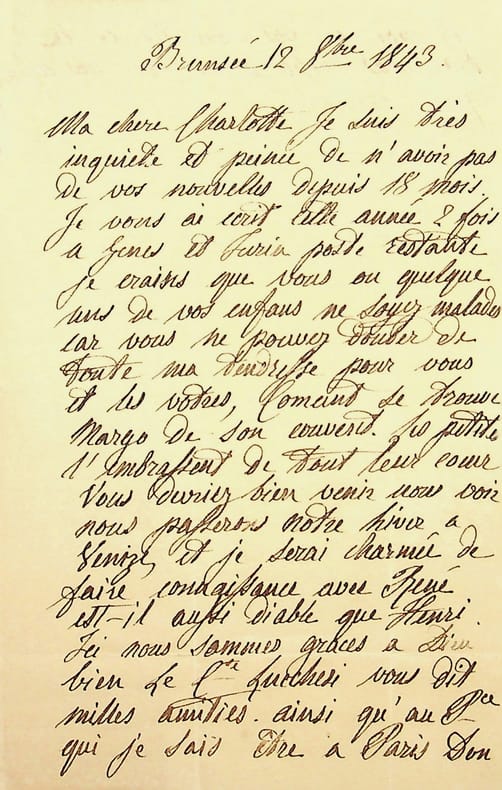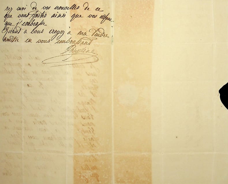 Marie-Caroline de Bourbon-Siciles (1798-1870), Duchesse de Berry. L.A.S., Brunsée, 12 octobre 1843, 1p 1/2 in-8. A Charlotte de Bourbon (1808-1886), princesse de Lucinge, fille naturelle de son défunt mari. « Ma chère Charlotte, Je suis très inquiète et peinée de n'avoir pas de vos nouvelles depuis 18 mois. Je vous ai écrit cette année 2 fois à Gènes et Turin poste restante. Je crains que vous ou quelque uns de vos enfants ne soyez malades car vous ne douter de toute ma tendresse pour vous et les vôtres. Comment se trouve Margo de son couvent. Les petites l'embrassent de tout leur coeur. Vous devriez bien venir nous voir, nous passerons notre hiver à Venise et je serai charmée de faire connaissance avec René. Est-il aussi diable que Henri. Ici nous sommes grâce à Dieu bien. Le comte de Lucchesi vous dit mille amitiés. Ainsi qu'au Prince que je sais être à Paris. Donnez-moi de vos nouvelles de ce que vous faites ainsi que vos enfants que j'embrasse. Quant à vous, croyez à ma tendre amitié en vous embrassant. Caroline ». Beau cachet de cire avec la devise : « L'asile le plus sûr est le sein d'une mère » (Fables de Florian, La Mère, l'enfant et les sarigues, Livre II, fable I). Provenance : Pierre Bergé & associés, 25 juin 2015, n°56. Sympathique lettre. [133]