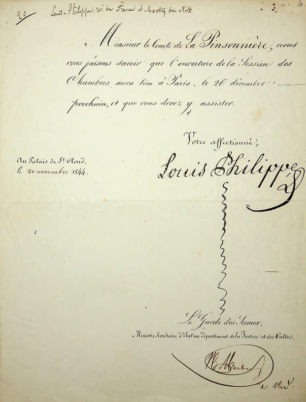 Louis-Philippe 1er (1773-1850), roi des Français ; Nicolas Martin du Nord (1790-1847), homme politique, garde des Sceaux. P.S. par les deux, Palais de Saint Cloud, 20 novembre 1844, 1p in-4. Convocation pour l'ouverture de la session des chambres le 26 décembre. Cette convocation est imprimée. Seuls le nom du député, la date et les signatures sont manuscrits. Le trait en zigzag sous la signature de Louis Philippe est imprimé. Lettre envoyée au comte de La Pinsonnière, i.e. Alexis-Jacques-Louis-Marie Lhomme (1788-1869), pair de France, député de 1833 à 1848, maire de Civray-en-Touraine du 1830 à 1839. Joli document. [133]