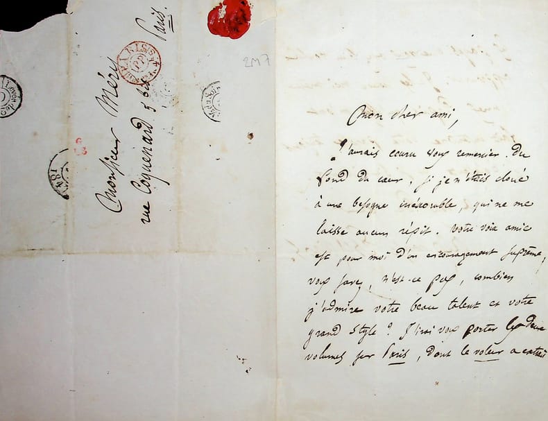 Lettre autographe signée "votre ami Gérard" adressée à Joseph Méry. Enveloppe présentant un petit manque angulaire, inhérent au cachetage, jointe. Pliures transversales. Cette lettre a été transcrite dans la correspondance éditée à la Pléiade (tome 3, p. 811). "Envoyez vite à Théo ce qui est imprimé de la pièce. Il fera de grandes citations surtoutle Serpent."La "pièce" en question estGusman le Bravecréée à l'Odéon le 23 septembre 1853. Le 4 octobre, Théophile Gautier entretiendra de cette pièce les lecteurs deLa Presse."Le Serpent"est une allusion au récit de José à l'acte II, scène 1. - Photographies et détails sur www.Edition-Originale.com -
