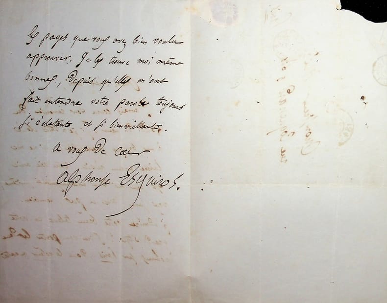Alphonse Esquiros (1812-1876), écrivain, homme politique. L.A.S., sd [1847], 2p in-8. A l'écrivain Joseph Méry (1797-1866). « Mon cher ami, J'aurais couru vous remercier du fond du coeur, si je n'étais cloué à une besogne inexorable, qui ne me laisse aucun répit. Votre voix amie est pour moi d'un encouragement suprême, vous savez, n'est-ce pas, combien j'admire votre beau talent et votre grand style ? J'irai vous porter les deux volumes sur Paris, dont le voleur a extrait les pages que vous avez bien voulu approuver. Je les trouve moi-même bonnes, depuis qu'elles m'ont fait entendre votre parole toujours si éclatante et si bienveillante. A vous de coeur Alphonse Esquiros ». Esquiros vient en effet de publier Paris, ou Les sciences, les institutions, et les mours au XIXe siècle. Belle lettre amicale. [110]