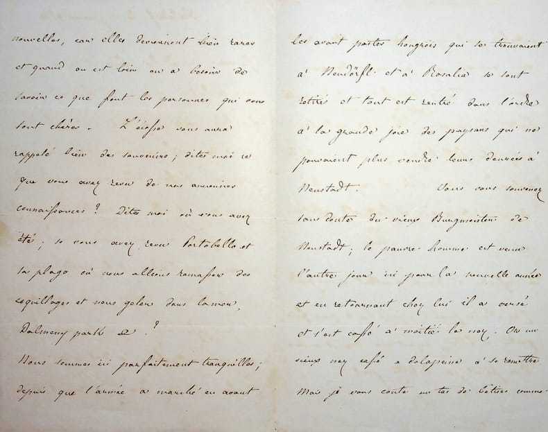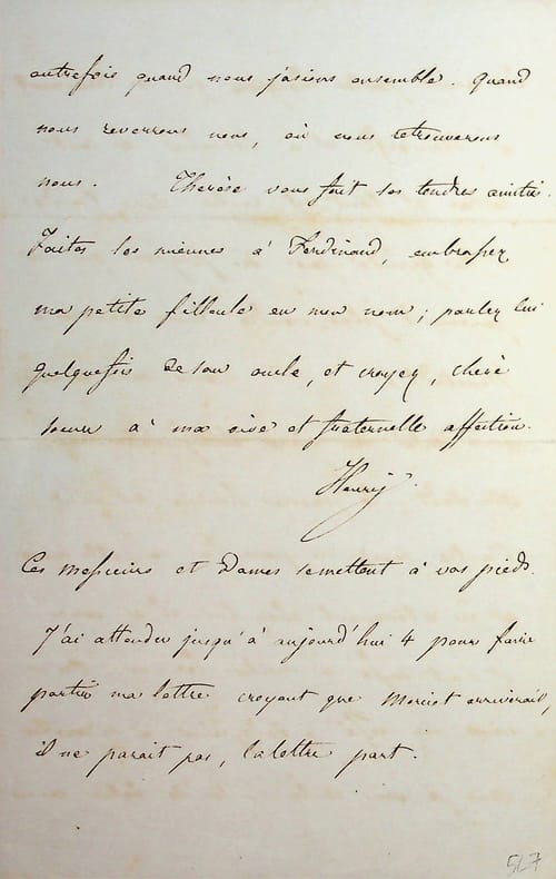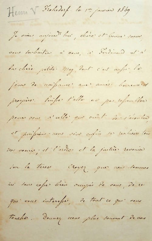 Henri d'Artois (1820-1883), duc de Bordeaux, comte de Chambord, roi de jure sous le nom d'Henri V. L.A.S., Fröhsdorf, 1er janvier 1849, 4p in-8. A sa soeur, la princesse Louise de Parme (1819-1864). «Je viens aujourd'hui, chère et bonne sour, vous souhaiter à vous, à Ferdinand et à ma chère petite Mag, dont c'est aussi le jour de naissance, une année heureuse et prospère. Puisse-t-elle ne pas ressembler pour vous à celle qui vient de s'écouler, et puissions-nous voir enfin se réaliser tous nos voux ; et l'ordre et la justice revenir sur la terre. Croyez que nous sommes ici tous sans cesse bien occupé de vous, de ce qui vous intéresse, de tout ce qui vous touche. Donnez nous plus souvent de vos nouvelles, car elles deviennent bien rares et quand on est loin on a besoin de savoir ce que font les personnes qui nous sont chères. L'Ecosse vous aura rappelé bien des souvenirs ; dites moi ce que vous avez revu de nos anciennes connaissances ? Dites moi où vous avez été ; si vous avez revu Portobello et la plage où nous allions ramasser des coquillages et nous geler dans la mer, Dalmeny Park &c ? Nous sommes ici parfaitement tranquilles ; depuis que l'armée a marché en avant les avants postes hongrois qui se trouvaient à Neudörfl et à Rosalia se sont retirés et tout est rentré dans l'ordre à la grande joie des paysans qui ne pouvaient plus vendre leurs denrées à Neustadt. Vous vous souvenez sans doute du vieux Burgmeister de Neustadt ; le pauvre homme est venu l'autre jour ici pour la nouvelle année et en retournant chez lui il a versé et s'est cassé à moitié le nez. Or un vieux nez cassé a de la peine à se remettre. Mais je vous conte un tas de bêtises comme autrefois quand nous jasions ensemble. Quand nous reverrons-nous, où nous retrouverons-nous. Thérèse vous fait ses tendres amitiés. Faites les miennes à Ferdinand, embrassez ma petite filleule en mon nom ; parlez-lui quelquefois de son oncle, et croyez, chère sour à ma vive et fraternelle affection. Henri. Ces messieurs et dames se mettent à vos pieds. J'ai attendu jusqu'à aujourd'hui 4 pour faire partir ma lettre croyant que Merciet arriverait, il ne parait pas, ma lettre part ». On notera que Charles III (1823-1854), duc de Parme est appelé par un de ses autres prénoms, Ferdinand. Provenance : Hôtel des Ventes de Toulon, 13 mars 2015, n°37. Belle et rare lettre familiale, bien loin des lettres habituelles. [133]