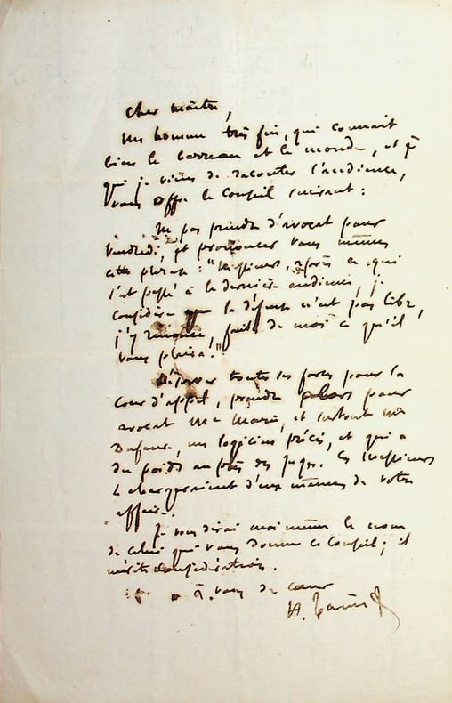 Hippolyte Taine (1828-1893), philosophie, historien, membre de l'Académie française. L.A.S., sd [fin décembre 1859 ou début janvier 1860], 1p in-8. Importante lettre à Etienne Vacherot (1809-1897) au moment de sa condamnation pour La Démocratie : « Cher Maître, Un homme très fin, qui connait bien le barreau et le monde, et à qui je viens de raconter l'audience, vous offre le conseil suivant : Ne pas prendre d'avocat pour vendredi, et prononcer vous-même cette phrase : "Messieurs, après ce qui s'est passé à la dernière audience, je considère que la défense n'est pas libre, j'y renonce, faites de moi ce qu'il vous plaira !". Réserver toutes les forces pour la cour d'appel, prendre alors pour avocat Me Marie, et surtout Me Dufaure, un logicien précis, et qui a du poids auprès des juges. Ces messieurs se chargeraient d'eux-mêmes de votre affaire. Je vous dirai moi-même le nom de celui qui vous donne ce conseil ; il mérite considération. A vous de coeur. H Taine ». En effet, lorsque Vacherot publie La Démocratie, enregistré dans la Bibliographie de la France le 12 novembre 1859, il est presque immédiatement poursuivi pour atteinte à la morale, à la religion, à l'autorité constitutionnelle de l'Empereur. Il est alors défendu par Emile Ollivier (1825-1913). Comme le montre notre lettre, la défense d'Ollivier ne semble pas très réussie. Après le réquisitoire, il a ainsi déclaré : « Messieurs, je ne répondrai point au Ministère public. Il a fait appel aux passions, cela est mauvais ». Il refuse de se rétracter. Vacherot suivra le conseil donné par Taine mais fit la déclaration par une lettre au président du tribunal. Il est alors condamné à 1 an de prison et 1000 francs d'amende. En appel, Jules Dufaure (1798-1881) ne le défendra pas. Il le sera uniquement par Pierre-Marie de Saint-Georges dit Marie (1797-1870) qui réussit à réduire la condamnation à 3 mois de prison. Il fit notamment sensation en lisant un extrait d'un livre qui indigna la cour et qui était écrit par. Napoléon III lui-même et extrait de son Extinction du paupérisme. Cette importante lettre a été publiée par Léon Ollé-Laprune dans sa biographie d'Etienne Vacherot (Paris, Perrin, 1898. p.46). Notons d'ailleurs qu'Ollé-Laprune ne partageait pas les idées de Vacherot. Toutefois, il lui succéda à l'Académie des sciences morales et politiques, ce qui explique ce livre. Très belle lettre de Taine. [133]
